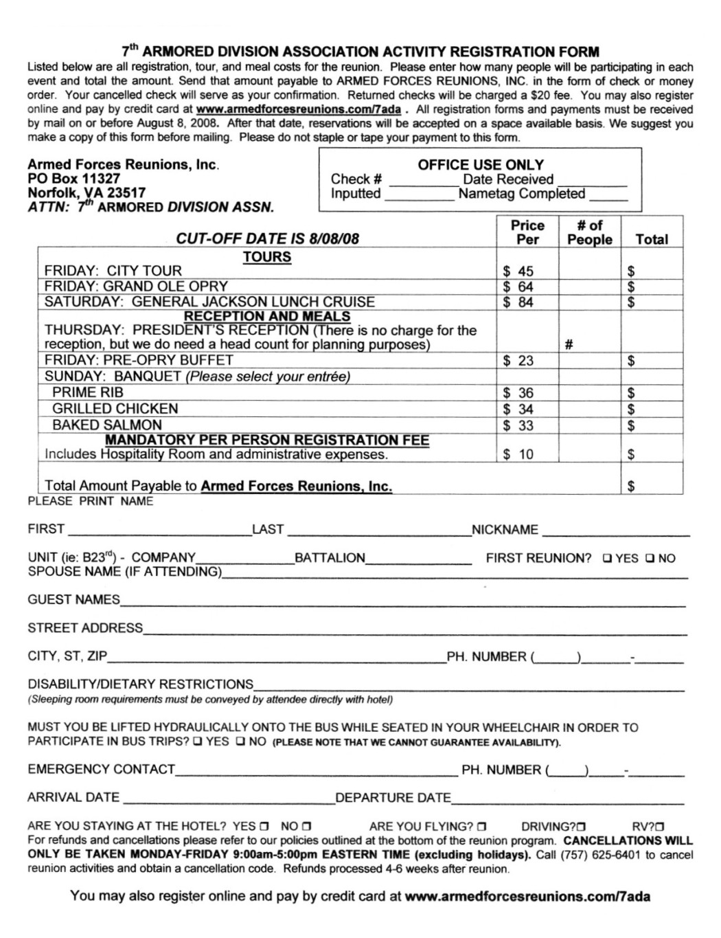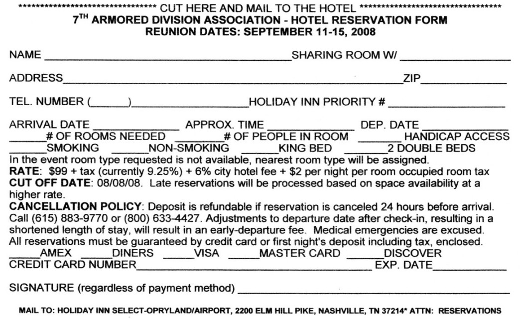 The Holiday Inn Select-Opryland/Airport is located at 2200 Elm Hill Pike, Nashville, TN 37214, just minutes from the Nashville International Airport (BNA). The Holiday Inn Select offers 385 spacious guest rooms each with coffee maker, color TV with cable channels, hairdryer, iron, and ironing board. Guest can also enjoy the hotels dry sauna, whirlpool, indoor pool, and onsite exercise facility. Handicapped and non-smoking rooms are subject to availability. Please request these special accommodations when making your hotel reservation. Parking for registered guest is complimentary. Check-in is at 3:00pm and check-out is at 12 noon. Jackson's Veranda serves breakfast, lunch, and dinner offering a variety of menu selections and weekday lunch buffets featuring a cook-to-order pasta station and traditional southern entrees. Room service is also available from 6:00am to 11:00pm. The hotel provides a complimentary shuttle to and from the Nashville International Airport (BNA) that runs every 20 minutes. You may want to consider other transportation, as space is limited on courtesy services. More information is available at the ground transportation level in the Airport Terminal. The hotel has limited parking space available for guests with RV's. Should you require full hook-ups, please call Nashville KOA at (615) 889-0286, Nashville's Jellystone Park at (615) 889-4225, or Two Rivers Campground at (615) 883-8559. Ask for information, reservations, and directions to determine which is best for you. Parks recommend reservations be made immediately due to limited space and availability. Should you need to rent a wheelchair for the reunion, ScootAround rents both manual and power wheel chairs by the day and week. Please call their toll free number at (888) 441-7575 for details. |